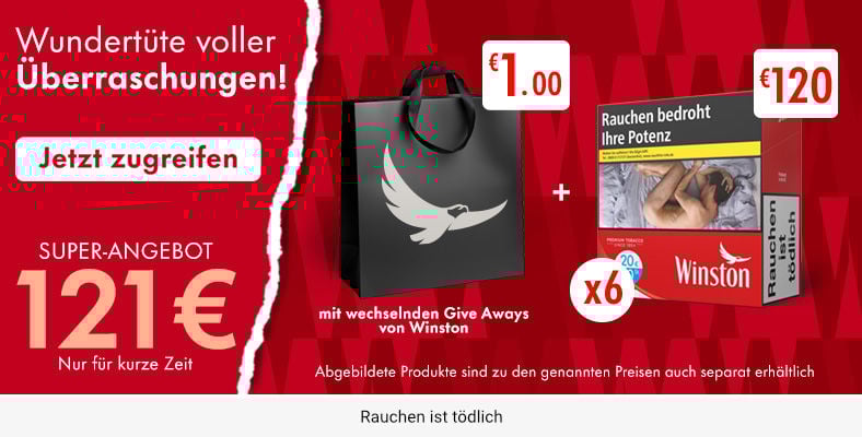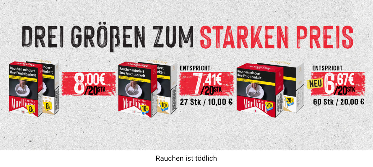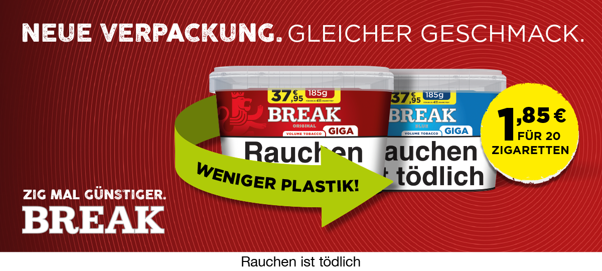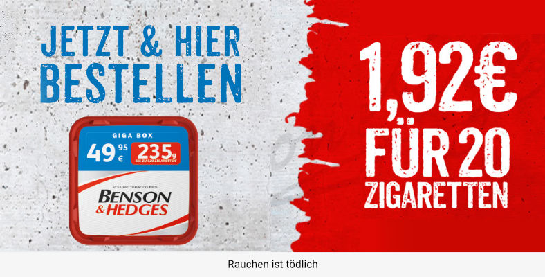 Bei uns findest Du alles, was das Raucherherz begehrt. Wir bieten Dir eine riesige Auswahl an Tabakwaren aller Art von Zigaretten über Tabak, Zigarren, Zigarillos, Tabakerhitzern bis hin zu E-Zigaretten uvm. Das alles und noch mehr kannst Du bei uns rund um die Uhr direkt günstig online kaufen. Dazu haben wir laufend neue Angebote und Sonderaktionen – wie z. B. unseren versandkostenfreien Montag. Es lohnt sich also regelmäßig vorbeizuschauen.