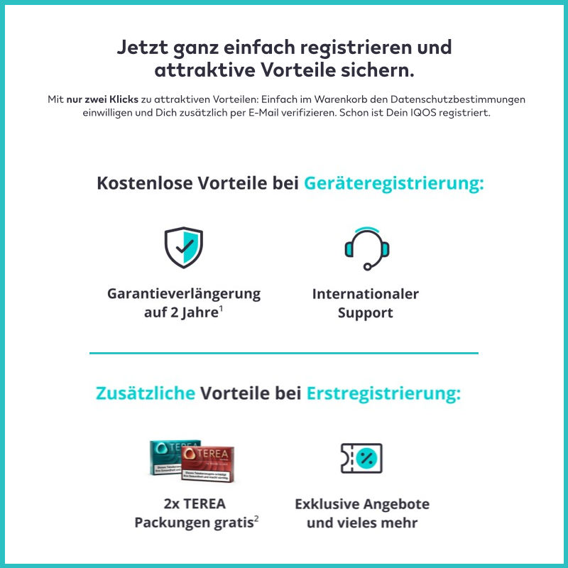Mit nur zwei Klicks zu attraktiven Vorteilen: Einfach im Warenkorb den Datenschutzbestimmungen einwilligen und Dich zusätzlich per E-Mail verifizieren. Schon ist Dein IQOS registriert.