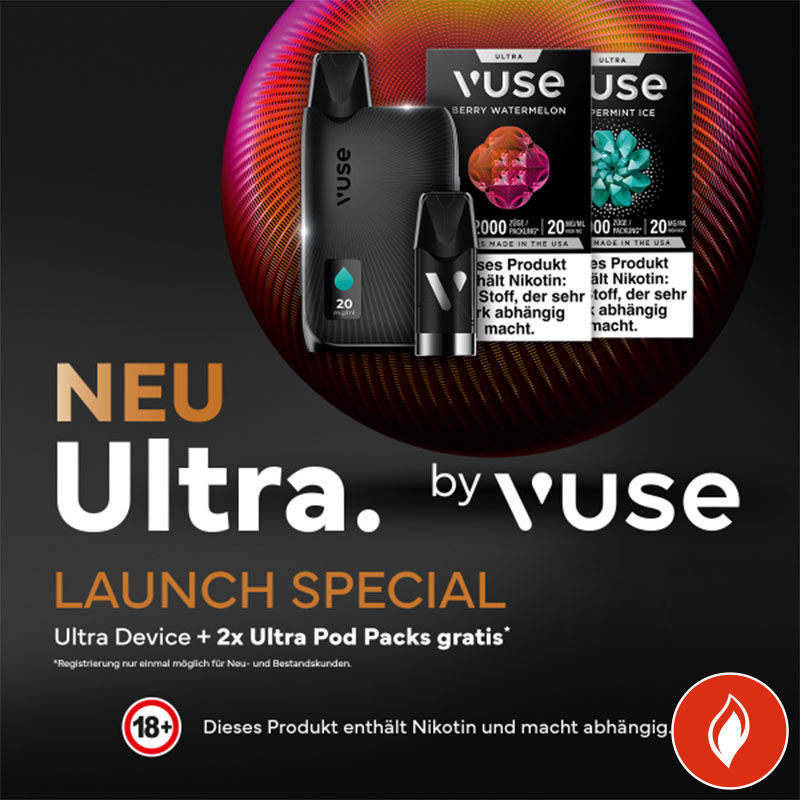 - Vuse Ultra & MyVuse App: Du bist der Chef! Passe das Dampferlebnis nach Deinen Vorstellungen an: Steuere Leistung und Intensität, behalte mit dem Nutzungs-Tracker die Anzahl Deiner Züge im Blick, werde benachrichtigt, wenn der Akku schwach wird! Alle Funktionen in nur einer App.